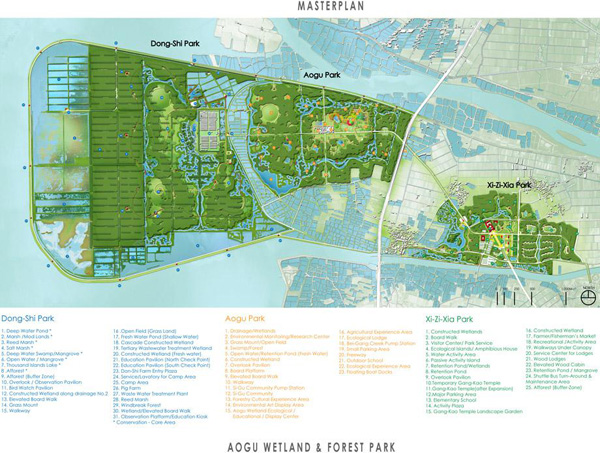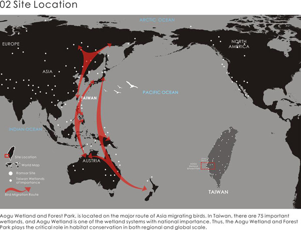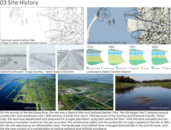 项目占地1600公顷并位于亚洲鸟类迁徙路线之上。湿地的基础是以前填海的土地。原来的土地不能继续使用是因为该区地表下陷和农耕停止。项目立足于人类发展的可再生居住策略,顺应场地自然系统的演进过程,并发挥其环境教育和生态旅游的意义。