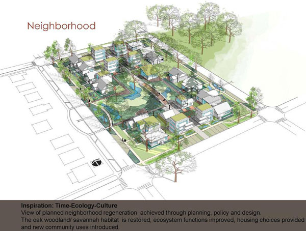 时间-生态-文化。社区的复兴通过规划,政策,设计实现。恢复橡树林地/热带草原生态栖息地生境,改善生态系统功能,增加住房选择和新社区功能。