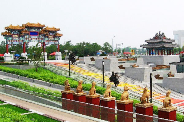 御道宫门是下沉花园的南侧入口空间,宽18米的御道台阶引导人们进入下沉9米的广场,正对大台阶入口设计了午门意象 的宫门,顶部飞檐结构表达了传统建筑的意象,从大台阶到宫门之间是36米见方的方形广场,古朴庄重;这是一个多功能的露天空间,它是集散空间,也是表演舞 台,它以宫门为背景,在宫门洞口两侧装有电动高清LED显示屏,可播放18米宽5米高的巨幅画面,具有露天剧场的完整功能,广场东南侧是树阵、跌水、喷泉 组成的休闲空间,长50米高6米的迭水墙面构成涨潮退潮的效果。