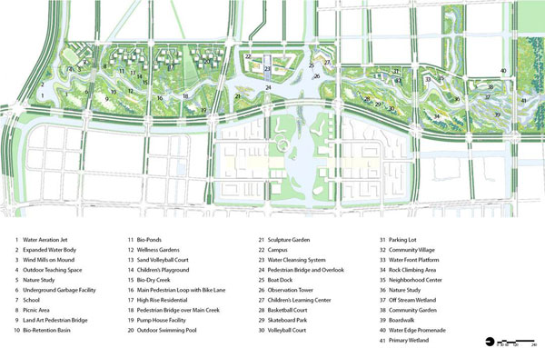 通过分析,设计师和相关专家提出了修建微型长江生态区的构想。在地势相对较低的山坡间建造水道网络以改善运河水质,将雨水径流引入新开发区域,修建河岸带为野生生物提供栖息地,为新居民提供兼具休闲娱乐和教育教学功能的场所。