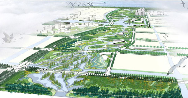 景观总体规划。宁波生态走廊工程将不适于居住的废弃棕地打造成绵延3.3公里的“活体过滤器”,旨在还原丰富多样的生态系统,并可作为城市可持续发展的教学典范。