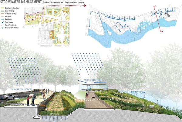 雨水径流经过集中收集、处理后排入主水道。整个过程已经得到验证并纳入园区计划中,还可用于以后的教育教学。