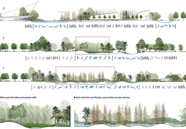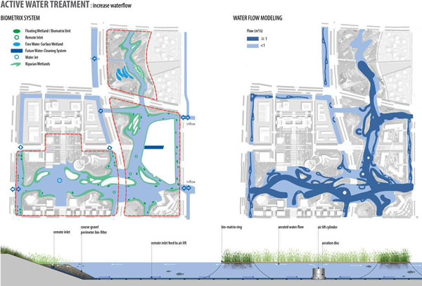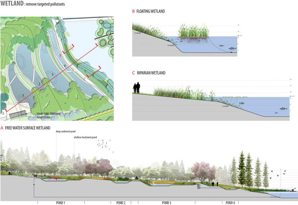 通过与水质学家合作,设计师通过使用主动和被动充气方法,促进地下水流穿过植物根系去除污染物。
