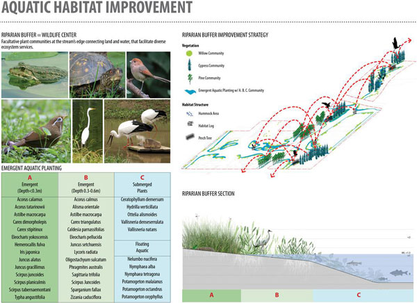 河岸缓冲带取代了运河防水抗渗的垂直河岸,缓冲带土壤松软,坡度偏缓,覆盖着植被。河岸植被边缘的绿色缓冲区形成水生环境,并有助于从运河水和雨水径流中去除污染物。