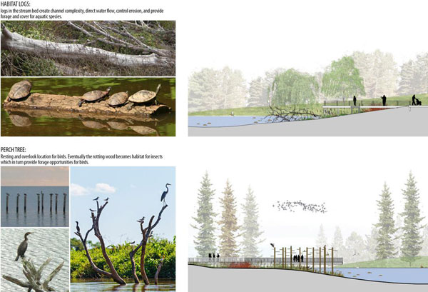 野生动物栖息地结构诸如原木栖息地和树木栖息地将沿着河岸边缘发育,构成复杂的栖息地,维持丰富的生物种类。