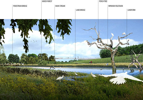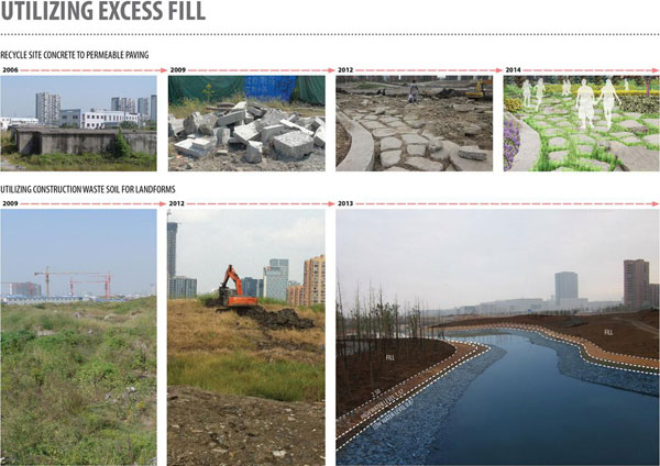设计团队还采取了可持续性建设,比如利用废弃的混凝土和周边城市发展产生的过量土壤建成起伏的景观地形引导水流途径,缓解城市环境,提供观景点以及增加生活环境多样性。