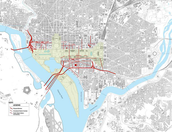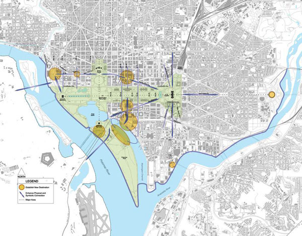 华盛顿特区的设计是伟大的艺术成就,也是国家与公民文化的象征,其表达了美国的民族认同和民主原则。在尊重原有的建筑物,纪念碑,重要公共空间的基础上,为城市,民主还有国家的不断发展有所贡献。突出National Mall的重要性,创造新的视觉和抽象印象关系,回复广场与街道的链接,为民所用,建立可持续的步行公共领域。