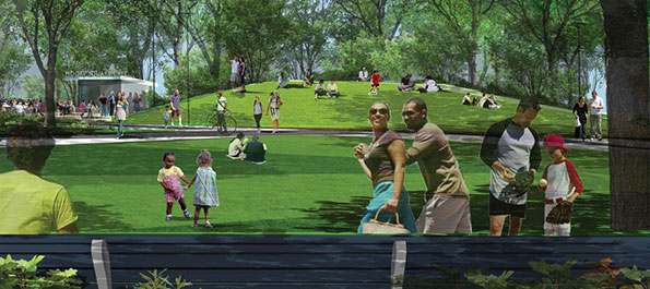 The gentle north slope of the landform becomes an iconic social generator, elevated prospect, and lawn amphitheater for formal and informal events.