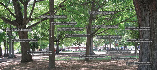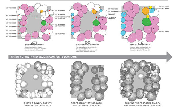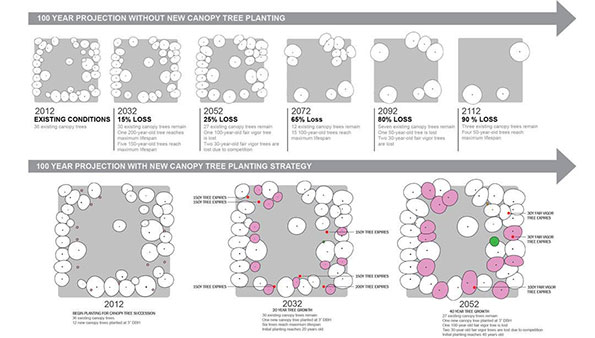 Proposed canopy tree planting locations, size, and species developed from detailed 100-year growth and decline projections. The resulting comprehensive recommendations emphasize the improvement of spacing, age