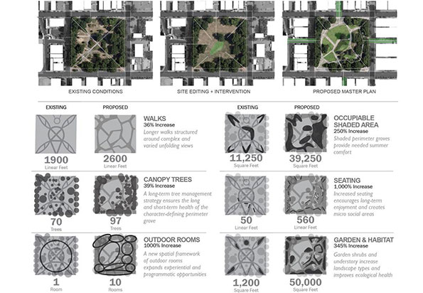 Existing site is endowed with a mature grove of canopy trees. The long term protection, enhancement, and celebration of this beloved urban amenity are major drivers of the design.
