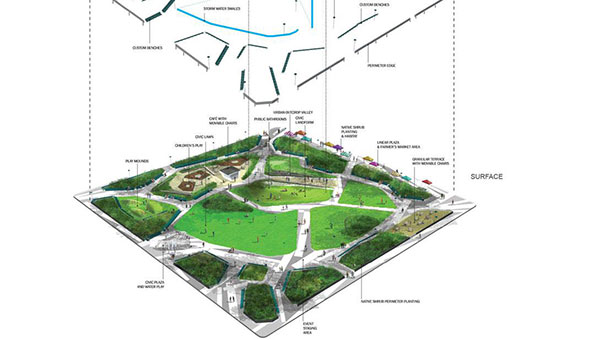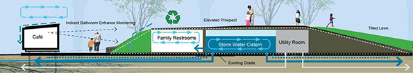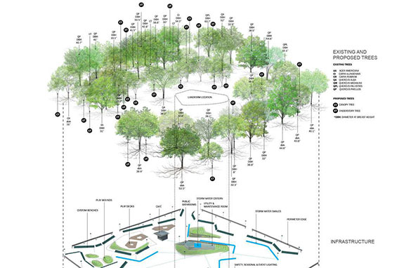 The landform acts as an above-ground infrastructure core that minimizes disturbance to existing root systems and houses a storm water cistern, bathrooms, and utility room.