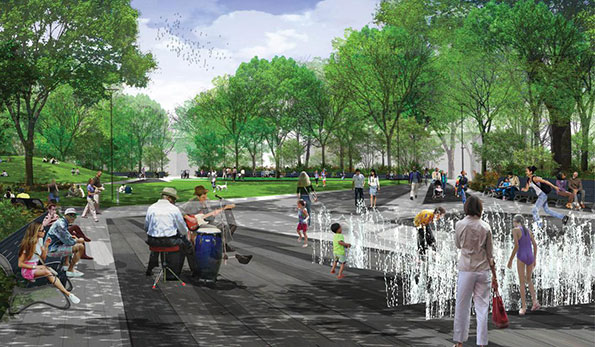 The interrelated layering of landscape types, program, and existing trees create a vibrant tapestry of dignified public spaces fitting of the square's rich ethnographic heritage.