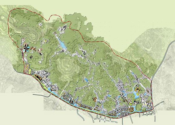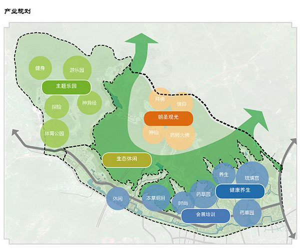 在景区发展模式上,强调山上山下互动模式。山上以保护性开发为主,按照国家5A景区环境容量标准,制定了强调整体文化资源和生态资源的保护策略,山上主要 以修建必要的旅游服务设施及恢复、修复及修建必要的文化设施(如带有旅游综合服务的观景平台系统、游客步道系统、及药师道场)。山下与新型城镇化下的小镇 建设结合,将旅游综合服务设施与小镇居民公共服务设施共享,使得山上自然生态与山下小镇融合发展。