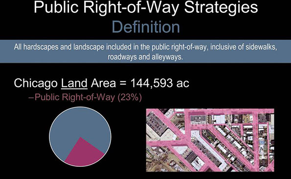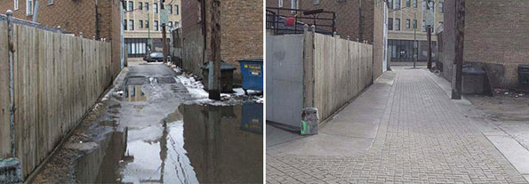 These before and after photographs illustrate Chicago’s green alley techniques, here using a permeable paver system. Currently, all new alley construction follows Green