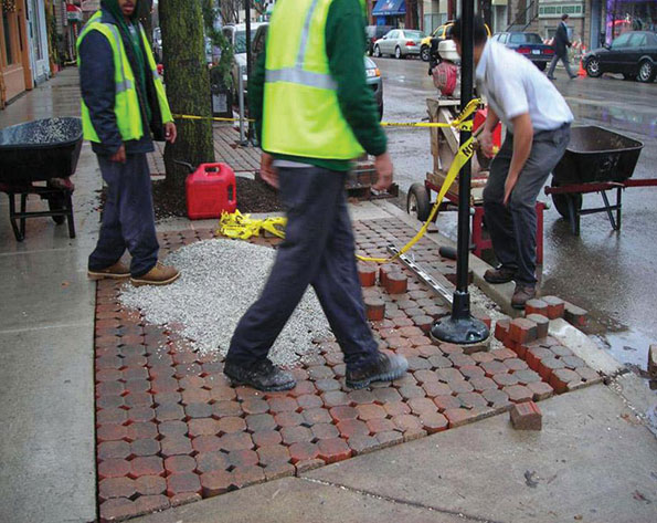This right-of-way must accommodate heavy pedestrian traffic and sidewalk cafes. Instead of using traditional landscaped parkways to absorb excess water, the pavers
