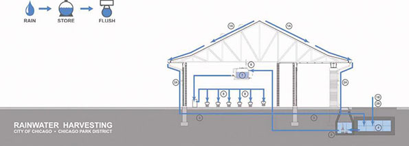 The Park District has also started using stormwater mitigation practices in the design of their comfort stations. This station collects stormwater from the roof and a patio