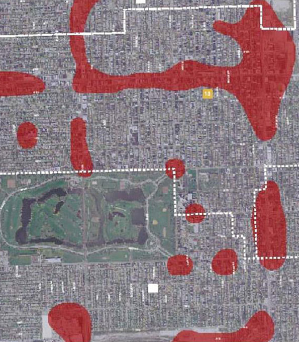 Environmental profile maps, such as this one illustrating elevated surface temperatures were developed for Chicago's 77 community areas (GUD Action 17.1). These maps