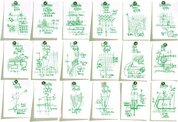 相信意大利建筑大师伦佐·皮亚诺(Renzo Piano)的草图表达是许多人热爱上建筑设计的缘由,也是众多设计师效仿的对象。其草图表达清晰,线条精炼至极,偶尔的色彩点缀让画面顿生美感,活泼灵动!是一种自信而成熟的建筑设计思维的直接流露~“灵感”怀着高涨的热情整理了一套大师的手稿供各位赏析。