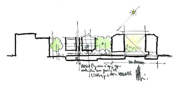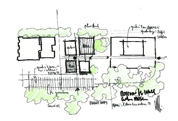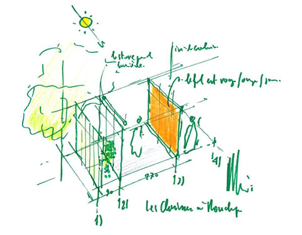 在构思一项设计时,我会采取的方式是:到项目地走走、倾听、素描,而最出人意料的,应是拉开距离。之后和许多同行的做法一样,会和员工一同合作。当我展开一项新工作时,会双手插在口袋,在项目地周围走上好一段时间,就只是四处走走。这么做就能感受到发生什么事,不用管理论或做错事的风险。我会去项目地一、两次,然后回来,开始思考,但还不画图。我等待,之后开始酝酿想法,也乐在其中。