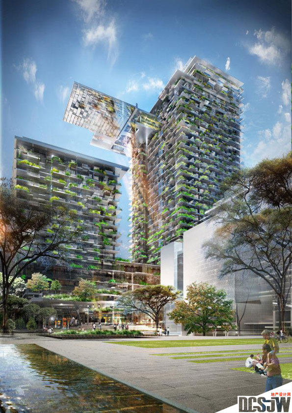基地2公里外即为悉尼市中心,所处区域为旧肯特酿酒厂基址和低层社区。(图02)为尊重这一城市文脉和肌理,综合开发采用了北高南低的布置模式,将历史遗址和绿地公园安排在场地中央。(图03)为了满足项目建筑面积的高密度和可持续性并在市区中营造出一片市民空间,项目中集中采用了多项技术创新。(图04)创造性的日光反射系统通过顶层可自动调节反射角度的日光反射机解决高层对中央公园和底层建筑采光的遮挡。(图05-06)综合采用了减少排放的三联产系统供电、供暖和冷却,全方位跟踪太阳能设计,利用雨水收集和中央再生水处理设备灌溉植物和循环利用。(图07)空中花园和无土壤栽培循环灌溉的“绿墙”增加了立体绿化率,植物的荣枯形成随季节变换的季节性自然遮阳,同时带来非凡的建筑外观。(图08-10)系统化的绿色建筑技术的使用使中央公园1号成为澳大利亚绿色建筑协会五星级绿色评级的绿色地标,在高密度的城市中心打造出一片高品质的都市豪宅。(图11-12)