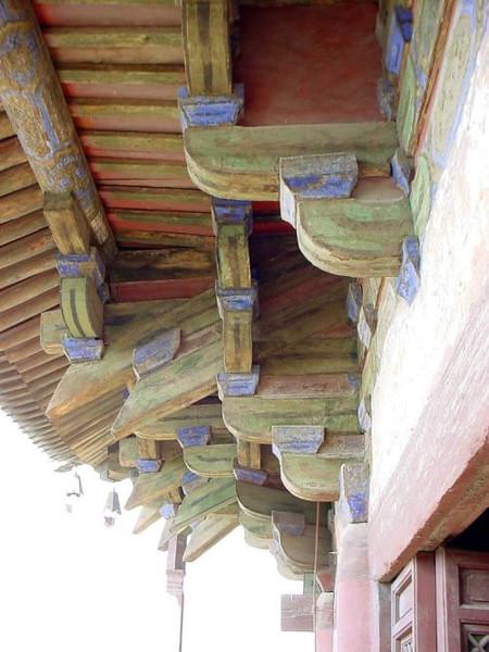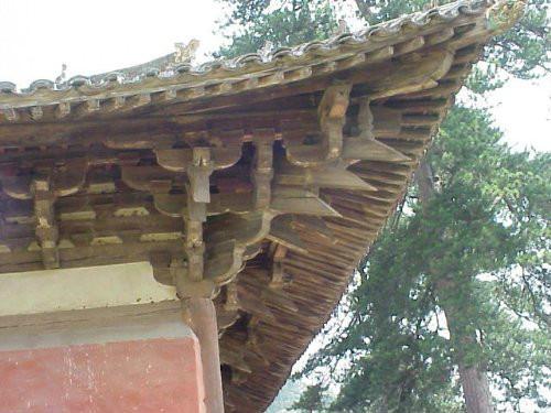 明清:昂变为装饰作用的假昂,斗拱变小,与柱高比1:8(?)以上,出檐变短,大约一米,斗拱变密,平身科多达4--8朵,明次稍间不同。