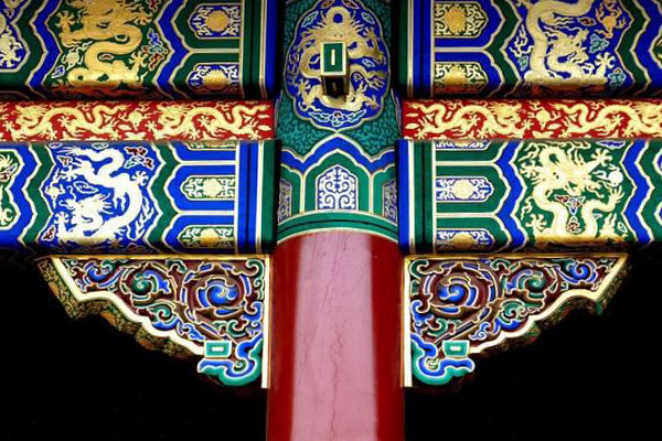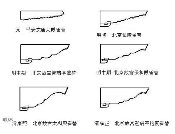 唐 代建筑上不用雀替,宋、辽、金、元的一些高级建筑上也有不用雀替的实例。南北朝、宋代早中期和辽代的雀替质朴无华。宋、辽的一些雀替有上下二木构成。宋末 和金代的雀替在其下部出现了蝉肚造型,元代的蝉肚造型最繁复,从明至清的蝉肚造型逐渐变简洁,但在底部另加一斗一拱。从明朝开始,雀替的前端部出现了鹰嘴 突样式,鹰嘴突的造型在清代最显著。明、清的雀替不仅彩饰,还浮雕卷草和龙等图案。