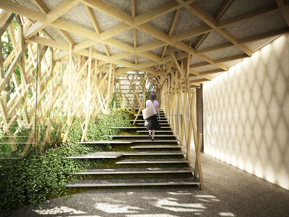 组件,相互之间形成了30度角。木网格让阳光自然地照射进室内,同时还提供了必要的私密性。