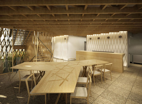 的空间包围住。通常,两块木条交叉会形成二维结构,但在包裹整个立面的过程中,建筑师将60mm x 60mm的木框结合成三维