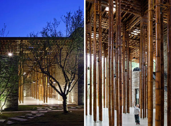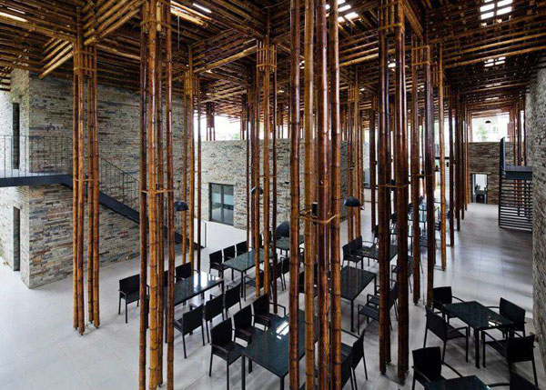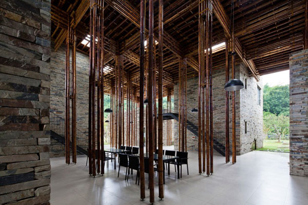 餐厅的屋顶是由一种能够生长到8米高的当地的竹子“luong”制成的。设计师将这个建筑设想为一个室内的竹林,屋顶由96根束柱支撑,每根束柱又包含了4根竹子。而结构所产生的剪切荷载则由十层交叉的竹梁来支撑,这些竹梁直接连接着石结构。