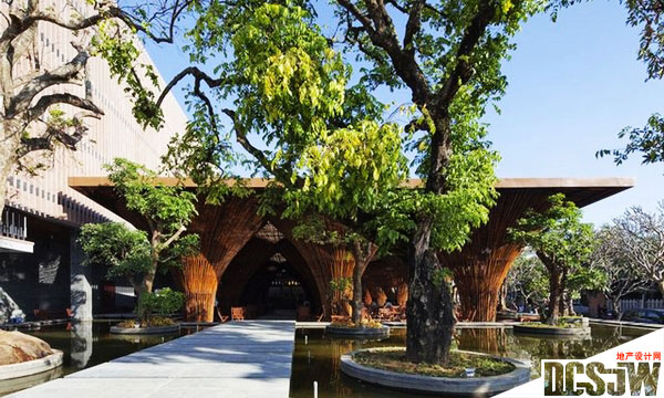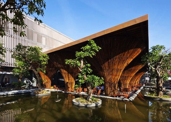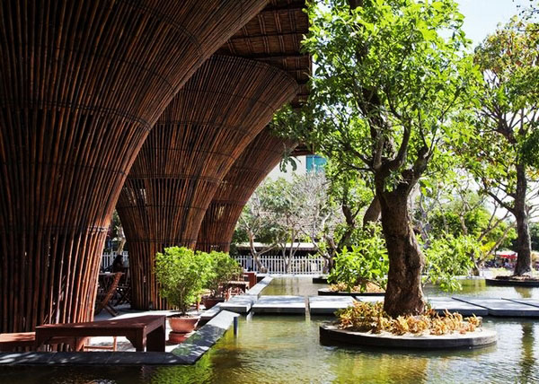 设计的灵感来自越南传统的捕鱼用的竹筐,屋顶采用茅草和增强纤维材料编制而成,光线可以很容易地透过,洒入餐厅内,形成斑驳的光影效果。用餐者的餐桌位于“竹伞”下,犹如置身水边竹林之中。Kontum Indochine Cafe没有任何墙的包围,可以对周围的水景与远处的山色一览无余。餐厅内没有设置空调,设计师解释道,通过周围的水池和树荫,及时在最热的季节这里也感觉凉爽舒适。