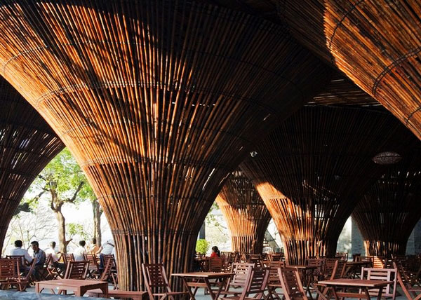 五排竹子构建成的大伞一样的柱子支撑着这座水边咖啡厅的屋顶。Kontum Indochine Cafe位于越南Kontum Indochine Hotel酒店内,设计来自:Vo Trong Nghia Architects