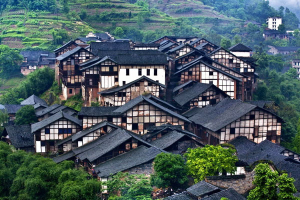 四川民居多为穿斗式屋架。这里的人们在建造民居时善于利用地形,因势修造,不拘成法。常常在同一住宅中,地平有数个等高线。住宅基地的退台有横向、有纵向,造成屋顶高低的配合。加上屋檐一般不高,绿影婆娑,润泽可悦,使人感到温适而明快。重庆及川东山区的民居不注重朝向,依山崖而建,吊脚楼伸出很大,有的层层出挑,气魄宏大,雄伟异常。