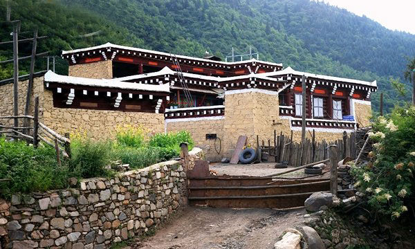 有些人家千里迢迢地买回来电冰箱, 然而康巴地区最热的夏季,在房间里呆着都要穿件薄毛衣,电冰箱自然无用武之地,只能充当储藏柜。民居的第三层通常用来堆放粮食和杂物,不用彩画。顶部修造得结实、平展,用以晾晒粮食,是很好的大凉台。人站在上面可以环视绿野乡村和远处的雪岭江流。大凉台上设置着牛首造型的香炉,用来燃烧香草、柏树枝叶,以敬奉神佛。这一带的人家也有在院子的墙院上和房顶四角上安放白色石头的习俗,显示出古人白石崇拜的痕迹。康巴地区的民宅、寺以及各地的碉楼、佛塔,多是由能工巧匠不画图、不吊线直接施工建成的。几百年来任凭风吹雨打地震而经久不塌,实在是一个奇迹!