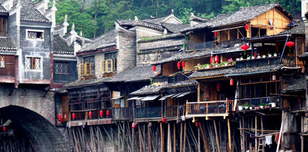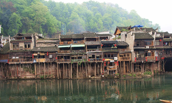 在西南地区广西、贵州、湖南、四川等省份,“湘西吊脚楼”是山乡少数民族如苗、侗、壮、布依、土家族等的传统民居样式。尤其在黔东南,苗族、侗族的湘西吊脚楼极为常见。这里的自然条件号称“天无三日晴,地无三里平”,于是山区先民创造出了独特的“湘西吊脚楼”。