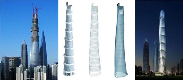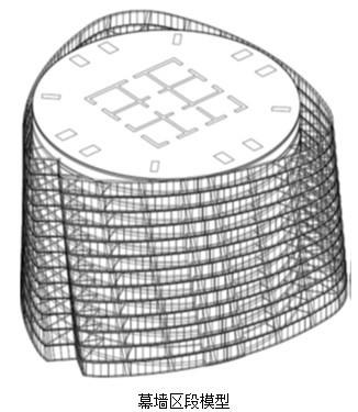 中国最高建筑——上海中心大厦的幕墙系统采用了独特的双层幕墙系统,其中内幕墙沿楼面边缘呈圆柱式布置,外幕墙平面呈圆角三角形,且呈现扭转收缩上升的几何形态,远离主体结构悬挂在上下两道加强层之间。由于外幕墙体量巨大、几何形态不规则,且采用柔性的支撑结构体系,给外幕墙的分析、设计、建造带来许多前所未有的技术挑战。