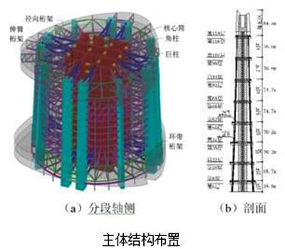 塔楼主体结构采用巨型框架-伸臂-核心筒结构体系。巨型框架由8根巨型柱、4根角柱及8道位于加强层的箱形空间环带桁架组成。巨型柱和角柱均为钢骨混凝土柱,分别在8区顶部和5区顶部终止。两层高的箱形环带桁架既是抗侧力体系巨型框架的一部分,也是建筑周边次框架柱的转换桁架。核心筒平面形状沿高度根据建筑平面功能作相应调整,底部平面为30m×30m的方形布置,中部为切角方形布置,顶部为十字形布置。塔楼的2,4~8区共设置了6道两层高的伸臂桁架。伸臂桁架将巨型柱与核心筒联系起来,既能约束核心筒的弯曲变形,又能高效地利用周围的8根巨型柱以减小结构的整体变形和层间位移。此外,各分区的加强层均设置了径向桁架作为幕墙结构的支承系统。