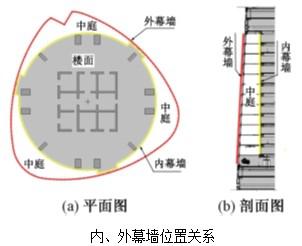 上海中心大厦采用了独特的内、外双层幕墙系统,内幕墙沿着楼板边缘呈圆柱式置。远离主体结构且扭转收缩向上的外幕墙系统是这座建筑区别于其他超高层建筑的显著特点之一。外幕墙平面形状呈一个三边鼓曲、三角倒角的等边三角形,在高度方向,绕着圆柱体楼面逐层旋转、收缩向上,由此导致内外幕墙在空间上分离。整个外幕墙系统被外伸的设备层在垂直方向上分成相对独立的9个区域(9区为塔冠区),每个区在内外幕墙之间形成宽度变化并向上延伸的12~15层、高约55~66m的流线形中庭空间。