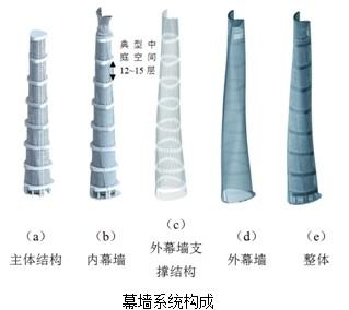 外幕墙从底到顶经过120°的旋转上升,创造了形态柔和、螺旋上升的锥体建筑形态,赋予了整个塔楼一个非常独特标志性的造型和外部立面。整楼外幕墙总面积约13.5万m2,共由17000余块板块组成。