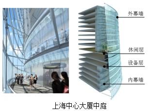 上海中心大厦的建筑师创造性地设计了从未在超高层建筑中大规模使用的双层独立玻璃幕墙,内外两层幕墙相互脱离,并只在休闲层与设备层相接,形成21个高挑、通透的中庭空间,使电梯转换层(休闲层)被充分利用成“空中大堂”,如同“垂直”城市中的空中街区广场,成为大楼各区的社交与配套服务中心,可以就“近”为空中大堂所连接的12~15层的人们提供餐厅、银行、商店等基本的配套服务,降低了人们下到地面的交通需求,既减少了麻烦,也降低了能耗。