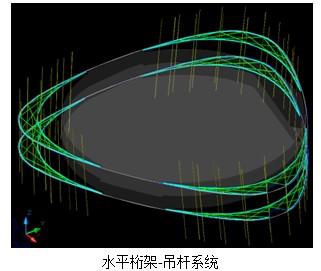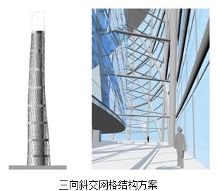 如何实现上海中心扭转收缩上升的外立面幕墙是整个塔楼结构设计的一个关键, 该幕墙突出的特点是几何造型非常不规则且与主体结构规则的几何形态不匹配,幕墙远离主体结构,同时对幕墙的视觉效果要求很高,在幕墙支撑体系的比选阶段,曾提出了刚性三向网格支撑结构方案及水平桁架-吊杆方案。三向网格支撑结构方案的优点是结构变形小,施工难度较低,但是,该方案对建筑外立面影响较大,结构用钢量大。水平桁架-吊杆方案,竖向采用吊杆,视觉通透性较好,但水平向杆件较多,严重影响中庭视觉效果。