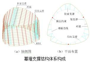 基于幕墙通透轻盈的要求,最终采用了分区悬挂的柔性幕墙支撑结构体系,该体系可有效地协调外幕墙不规则的几何形态和规则主体结构间的几何关系,同时相对主体结构能在一定程度上自由变形,从而减小结构构件内力,优化构件截面与形式。各区幕墙支撑体系均为独立的基本单元,并且采用相同的,由“吊杆-环梁-径向支撑”组成的柔性悬挂式幕墙支撑结构体系。