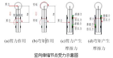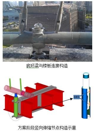 (1)底环梁竖向伸缩节点:该构造主要吸收变形量较大的主体结构的设备层变形、主体结构的压缩变形、风荷载等引起的两个设备层间相对竖向变形以及吊杆伸长变形,防止底层板块系统受到挤压而破坏。