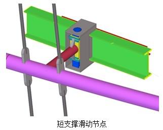 一般径向支撑采用铰接构造以吸收环梁与楼面的竖向位移差。对于长度很短的径向支撑,其线刚度大,对其两端的位移差非常敏感,采用滑动连接构造,以降低支撑因两端的位移差所产生的次内力。