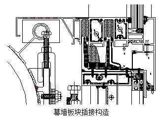 上下两层幕墙板块插接构造主要吸收在重力荷载、风荷载、地震作用下幕墙板块铝框与支撑结构环梁间的相对变形,温度作用下幕墙钢吊杆与铝框热膨胀系数差异引起相对变形,以及幕墙加工、安装时产生的误差。