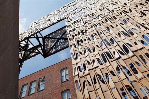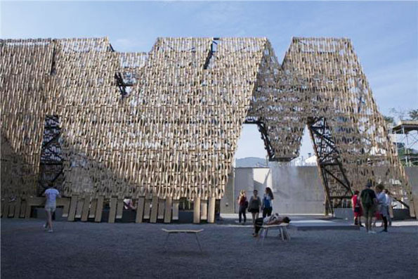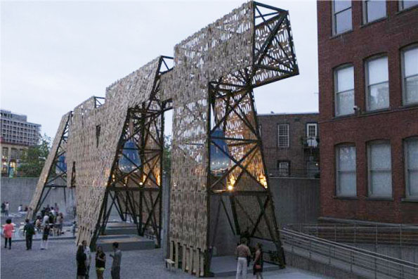由studio CODA建筑事务所完成的“滑板碎片”幕墙亮相2013年美国现代艺术博物馆音乐节,并成为最大的关注对象。整面幕墙都是由滑板木片残余构成,呈空隙状分布的幕墙非常适合音乐节这样的灵动性场所,因为这里聚集着大量的流动游客,这里通常会设有可拆卸的木质桌椅已经为行人提供遮荫避暑的小型广场。studio CODA建筑事务所充分发挥他们的奇思妙想,并取材当地进行设计。而正是这样的设计再一次向世人证明了:任何看似不可能的用材在一个富有创新性建筑师的笔下,都可以成为旷世之作的源泉和灵感。巨大的幕墙下面还设有喷泉池,巨大的泉水穿过幕墙的空隙洒落在人们的身上,增添了一份节日的活跃。