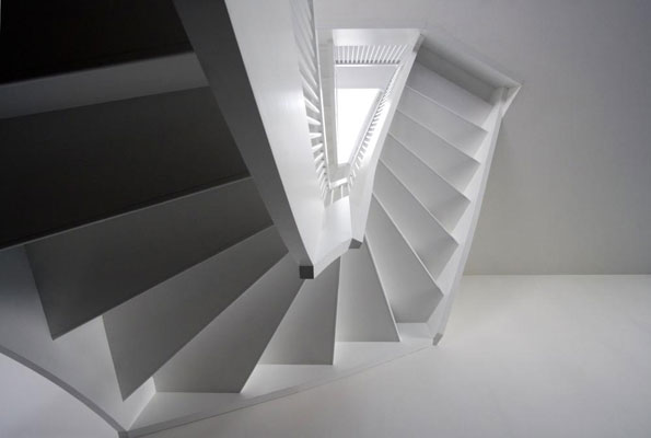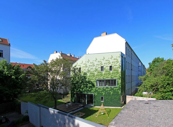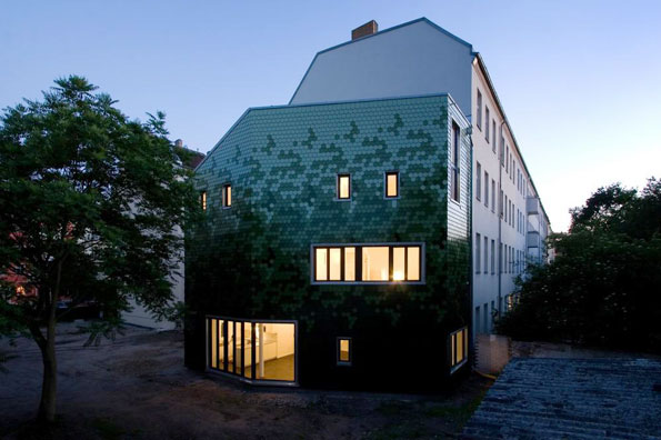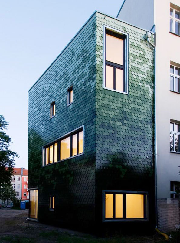 以叠加式的表面装饰材料进行装饰呈现出鱼鳞状的建筑立面效果