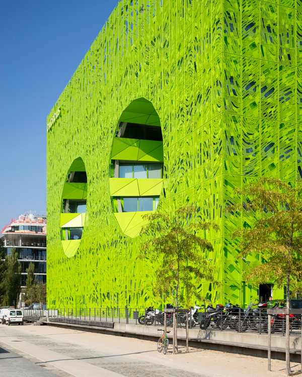 建筑的外立面采用了一种轻型的釉质幕墙,覆有不规则的多孔铝制包层。颜色上大胆的选择了绿色,其灵感是来源于河水的颜色,用这种形式在建筑和对岸起伏的景观之间建立联系。