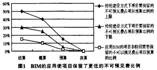 美国的一项研究显示,因BIM的应用提高了成本核算的准确性而使业主保留了比传统建设模式下更低的不可预见费。如图一所示: