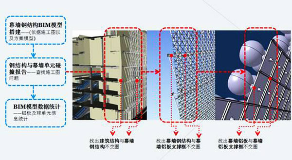 幕墙施工图设计中,本项目幕墙龙骨情况比较复杂,在二维图纸中很难考虑的面面俱到,而依据幕墙施工图搭建的BIM模型中进行幕墙碰撞检查,检查幕墙与结构不交圈,幕墙与钢结构不交圈的地方,幕墙模板与幕墙铝板支撑框不交圈的情况,能够对未探明区域提前进行模拟与碰撞检查,并对幕墙信息进行统计。提前预知幕墙施工质、量上的各种情况,对后期施工具有很大的帮助。