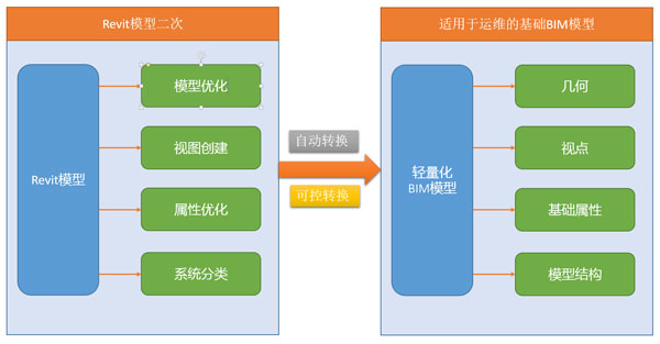 在这个环节中,考虑到在目前建筑市场中Revit的主导地位,所以BIM平台这块就选择以Revit为例进行描述。基于以往的经验,我们将数据重组和构建的过程划分为三个环节,分别是:BIM模型二次、基础BIM运维模型创建、运维BIM模型创建。